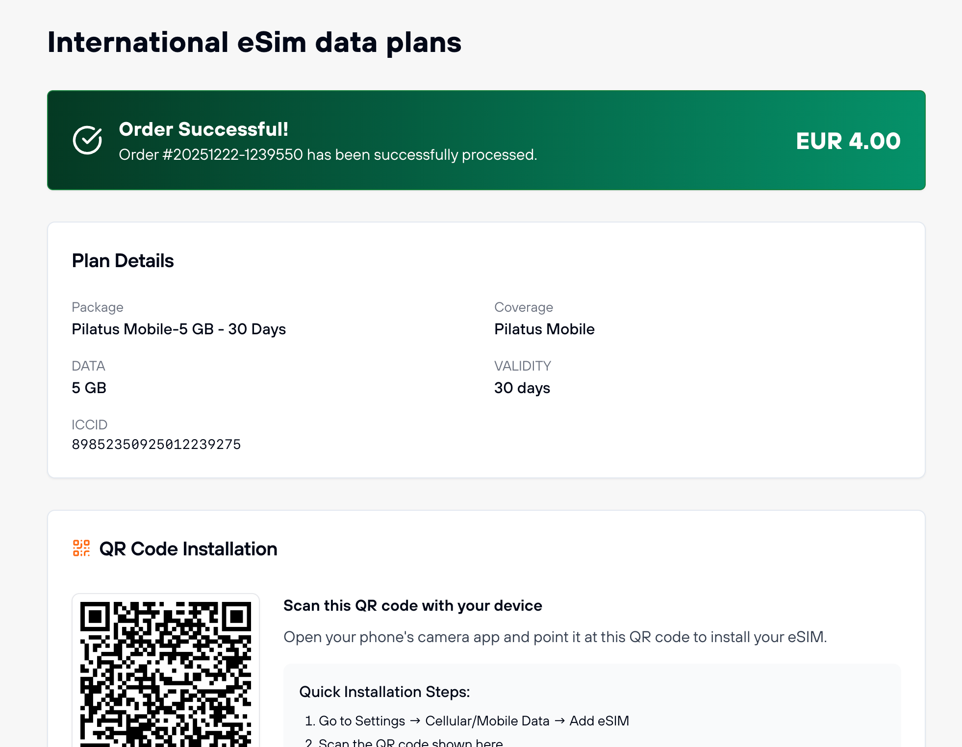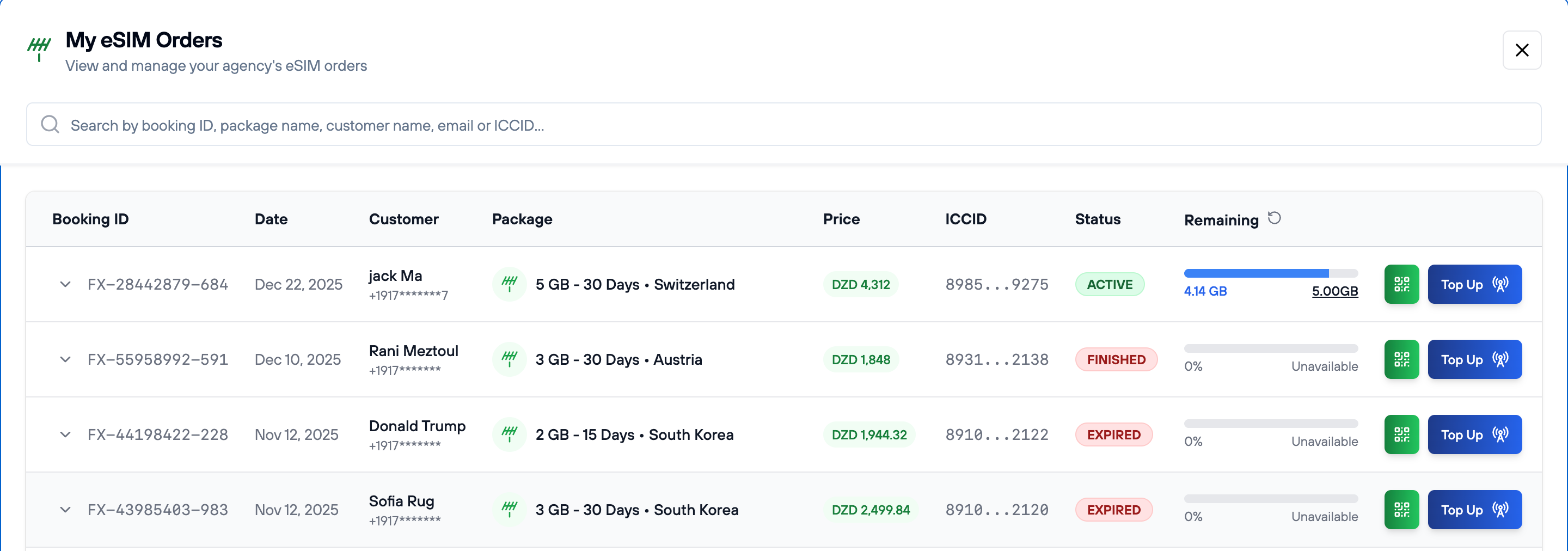 - Complete list of all eSIM orders with status indicators (active, pending, expired)