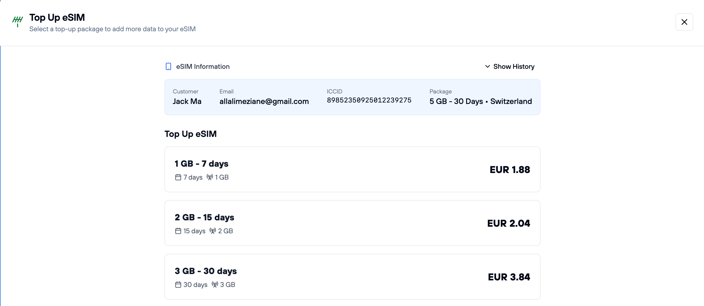 Once purchased, customers manage everything from their personal eSIM dashboard: